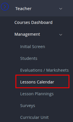 - In the “Teacher” tab, select “Management” → “Lessons Calendar” → “Courses Dashboard“’ → “Manage“.
