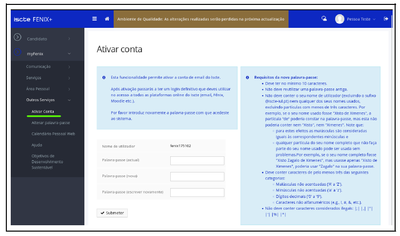 - Go to https://fenix-mais.iscte-iul.pt -> “MyFenix” -> “Other Services” -> “Ativate Account“.