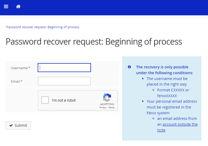 - Fill in the fields “Username“, “Email” (an email address from an account outside the Iscte that must be registered in the Fénix system), check “I´m not a robot” and click on “Submit“.