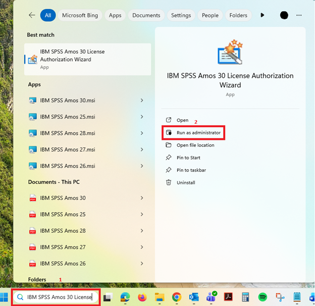 - In the Windows search bar, enter “IBM SPSS Amos 30 Licence Authorisation Wizard” and select the “Run as administrator” option.
