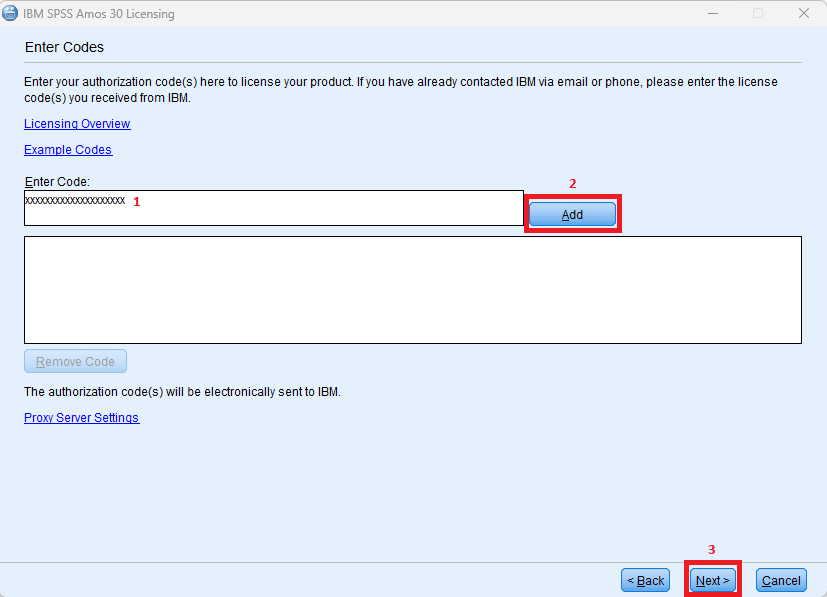 - Enter the authorization code provided by SIIC in the “Enter Code” field (1) and click “Add” (2). Click on “Next” (3).