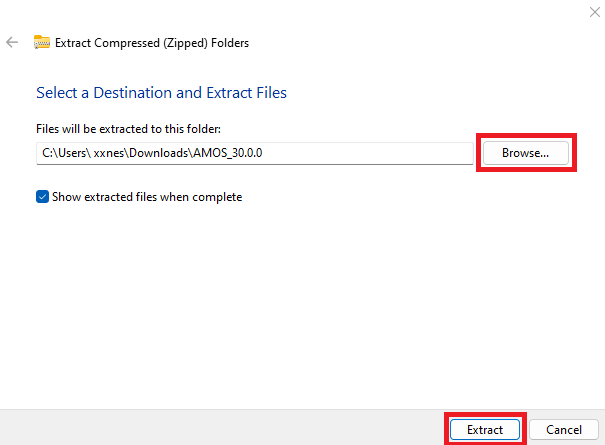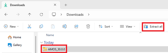 - Select the compressed folder “AMOS_30.0.0_Win” and click “Extract all“. If you prefer another location, select “Browse…” and choose the desired location. Select “Extract“.