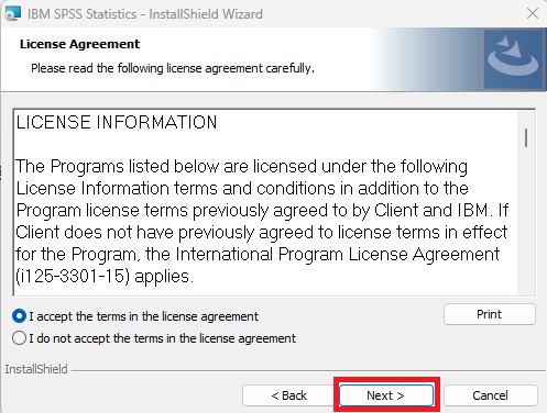 - Under “License Agreement”, select “I accept the terms in the license agreement” and click “Next”.