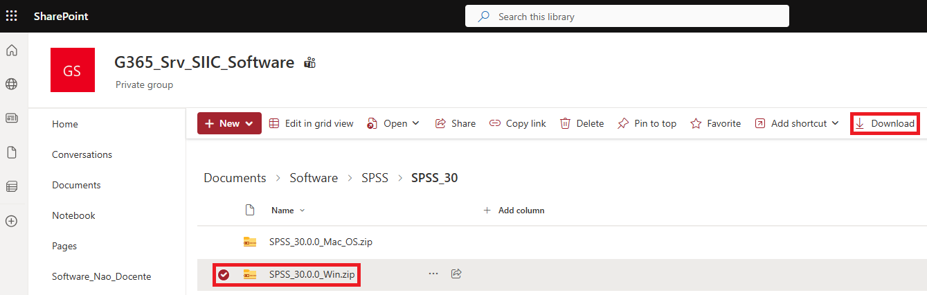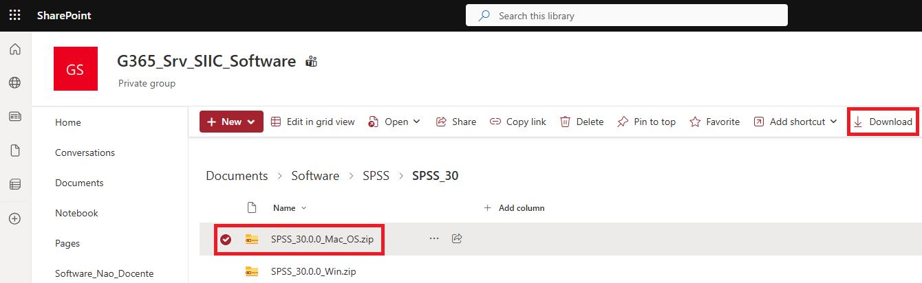 - Select the compressed folder “SPSS_30.0.0_Win.zip” and click on “Download”.