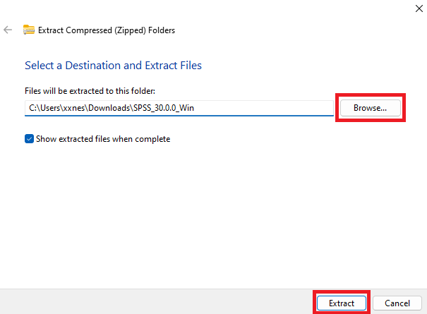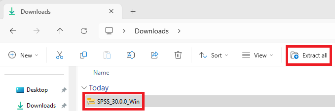 - Select the compressed folder “SPSS_30.0.0_Win” and click “Extract all“. If you prefer another location, select “Browse…” and choose the desired location. Select “Extract“.