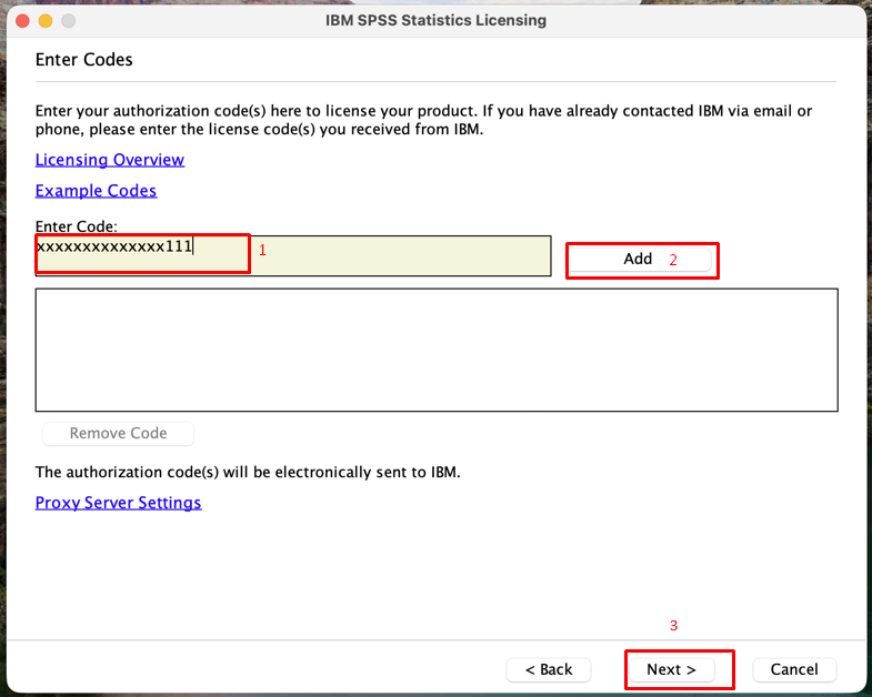 - Enter the authorization code provided by SIIC in the “Enter Code” field (1) and click “Add” (2). Click on “Next” (3).