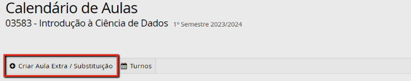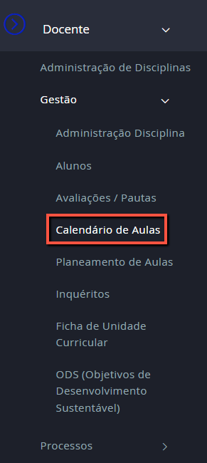 No separador “Docente“, selecionar sucessivamente “Gestão” → “Calendário de Aulas” → “Administração de Disciplinas” → “Gerir“.