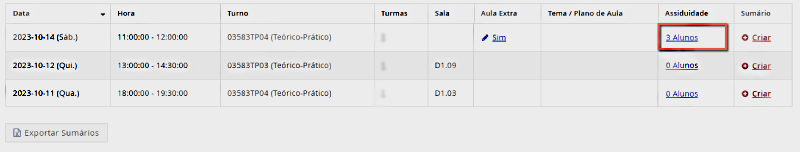 Identificar a linha da aula, verificando a “Data” e a “Hora” e clicar em “Alunos” na coluna “Assiduidade“.