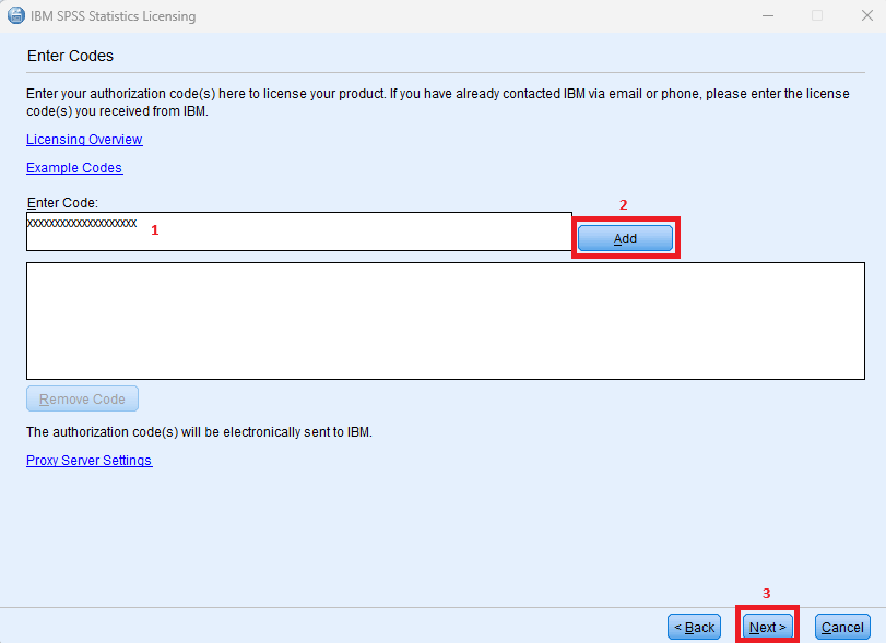 - Inserir o authorization code disponibilizado pelos SIIC no campo “Enter Code” (1) e clicar em “Add“ (2). Clicar em “Next“ (3).