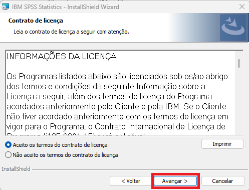 - Em “Contrato de licença”, selecionar “Aceito os termos do contrato de licença” e clicar em “Avançar”.
