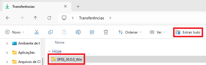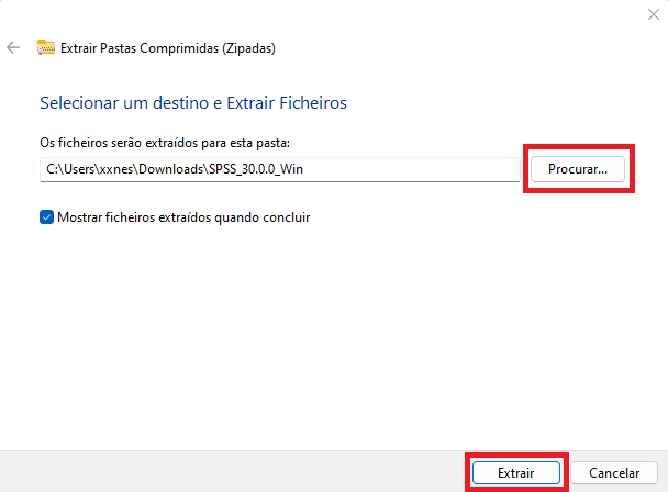 - Selecionar a pasta comprimida “SPSS_30.0.0_Win” e clicar em “Extrair tudo”. Se preferir outra localização, selecionar “Procurar…” e escolher a localização pretendida. Selecionar “Extrair“.