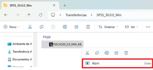 - Abrir a pasta “SPSS_30.0.0.0_Win” e a seguir o ficheiro “ISSCAS30_0.0_MW_ML”.